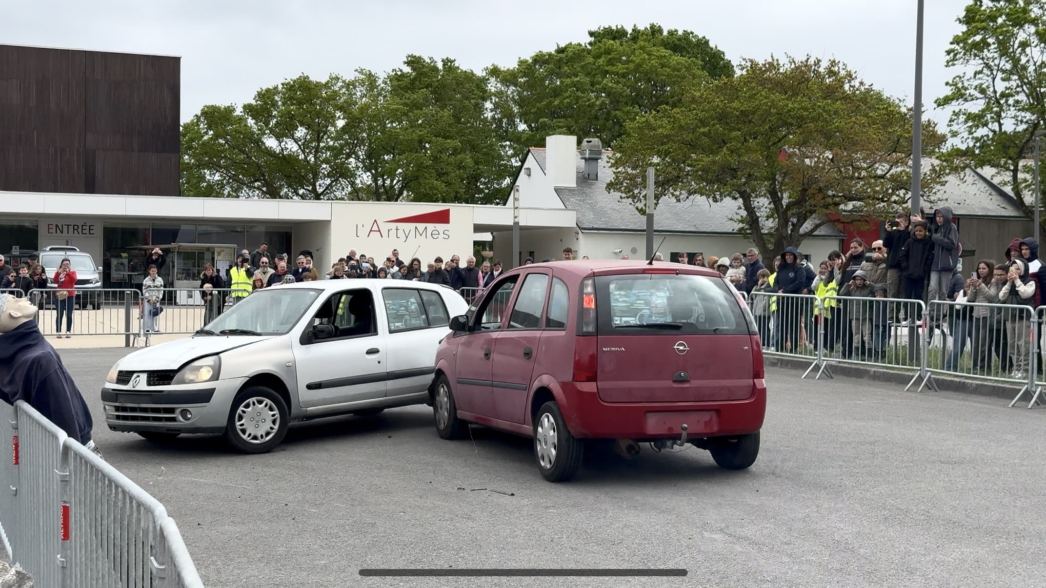 Cette démonstration de cascades met en scène trois collisions spectaculaires pour sensibiliser le public aux dangers de la route. Chaque impact – entre une moto et un vélo, une voiture et un scooter, puis deux voitures – est réalisé avec des mannequins pour illustrer, de manière réaliste et percutante, les conséquences d’un accident. L’objectif est clair : marquer les esprits, éveiller les consciences et rappeler que sur la route, chaque geste compte. Une initiative à la fois pédagogique et visuelle, pensée pour toucher toutes les générations.